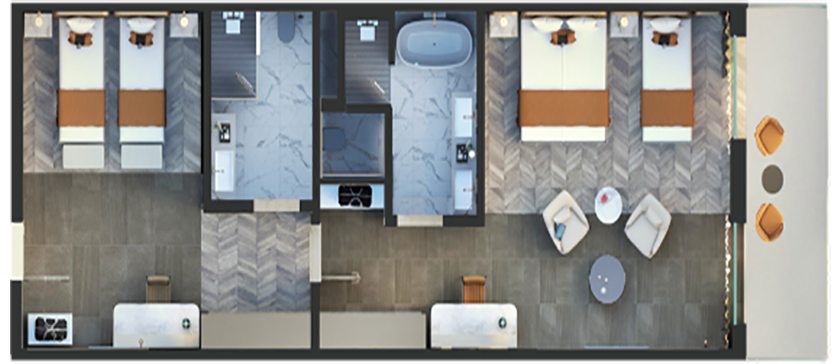 2 Oda, 2 Banyo , 4 Yatak 105m2 alan